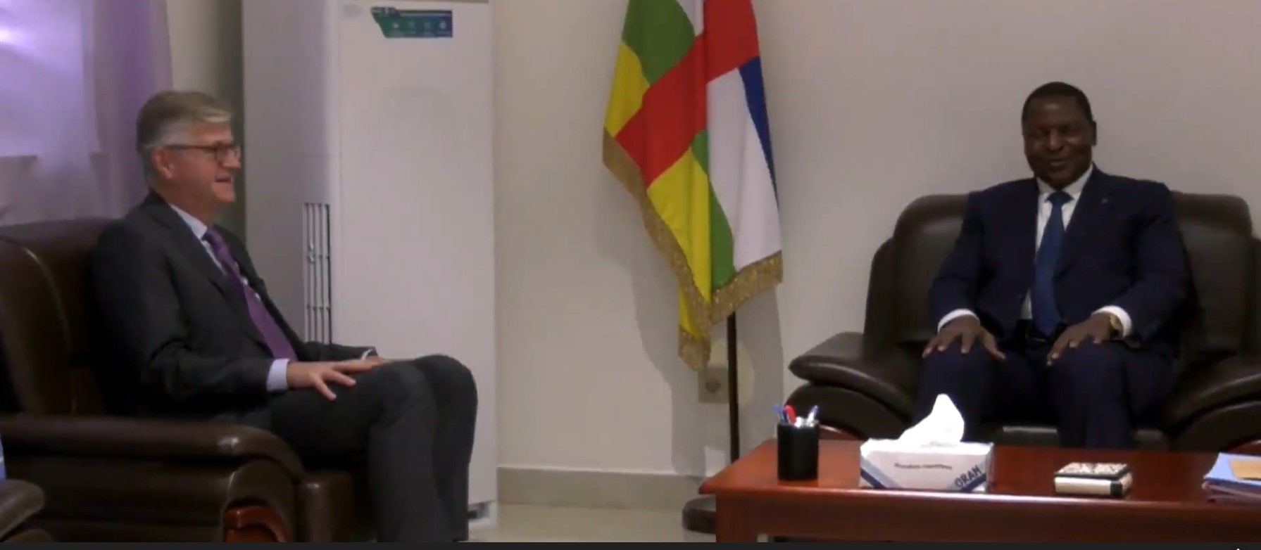 名人媒体根据联合国新闻中心提供的新闻综合报导:11月27日,拉克鲁瓦与MINUSCA特派团团长兼联合国秘书长特别代表瓦伦丁·鲁格瓦比扎(Valentine Rugwabiza)一同会见了中非总统福斯坦·阿尚奇·图瓦德拉(Faustin Archange Touadera)。会谈围绕中非政治进程的最新变化以及稳定团履行新任务的部署进行了深入交流。